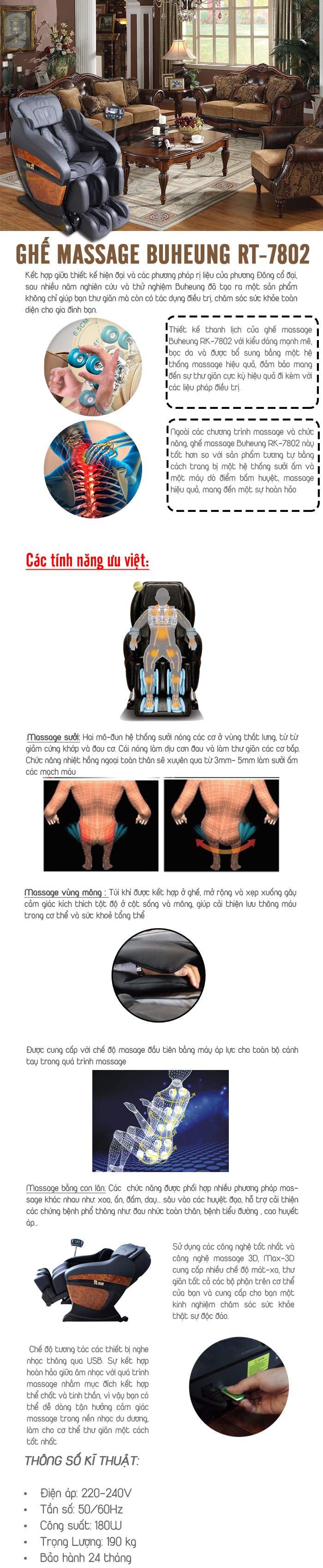 Ghế Massage Buheung RT-7802 được trang bị với những đột phá tiên tiến nhất trong thế giới khoa học và công nghệ, thiết lập một tiêu chuẩn mới trong ngành công nghiệp ghế massage. Các con lăn di chuyển lên và xuống dọc theo các vai, cổ, trở lại, và thắt lưng, và nó có thể tự động phát hiện các đường cong của cơ thể; chiều rộng của các con lăn có thể được điều chỉnh tự động trong phạm vi 6-21 cm, và tiếp cận thẳng đứng của họ có thể lên tới 81 cm, mà đảm bảo một chế độ massage đầy đủ từ phía sau.