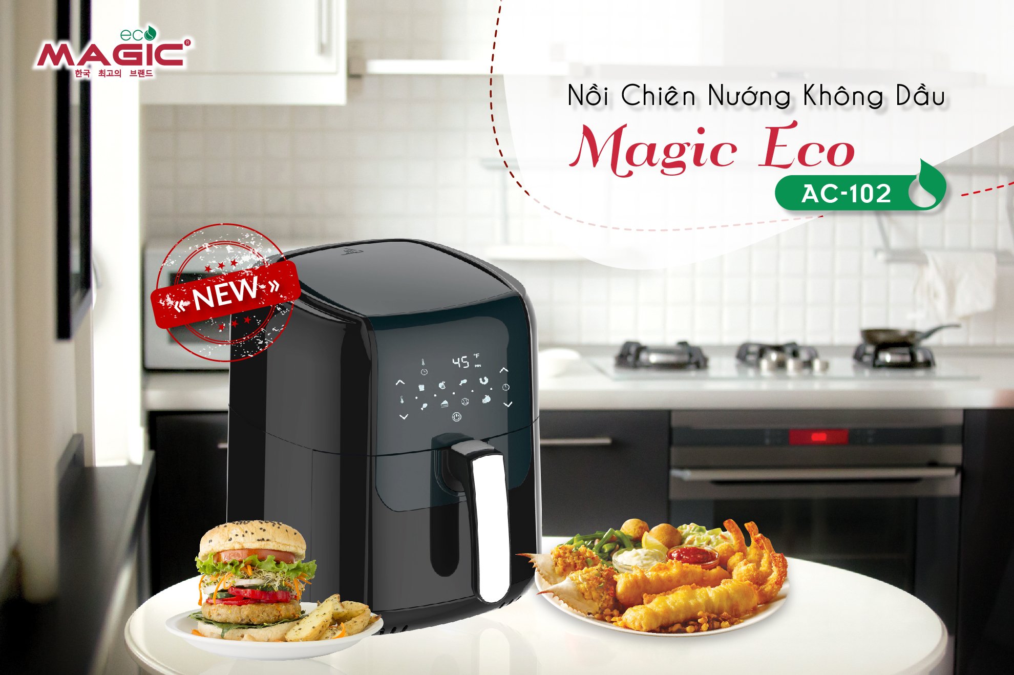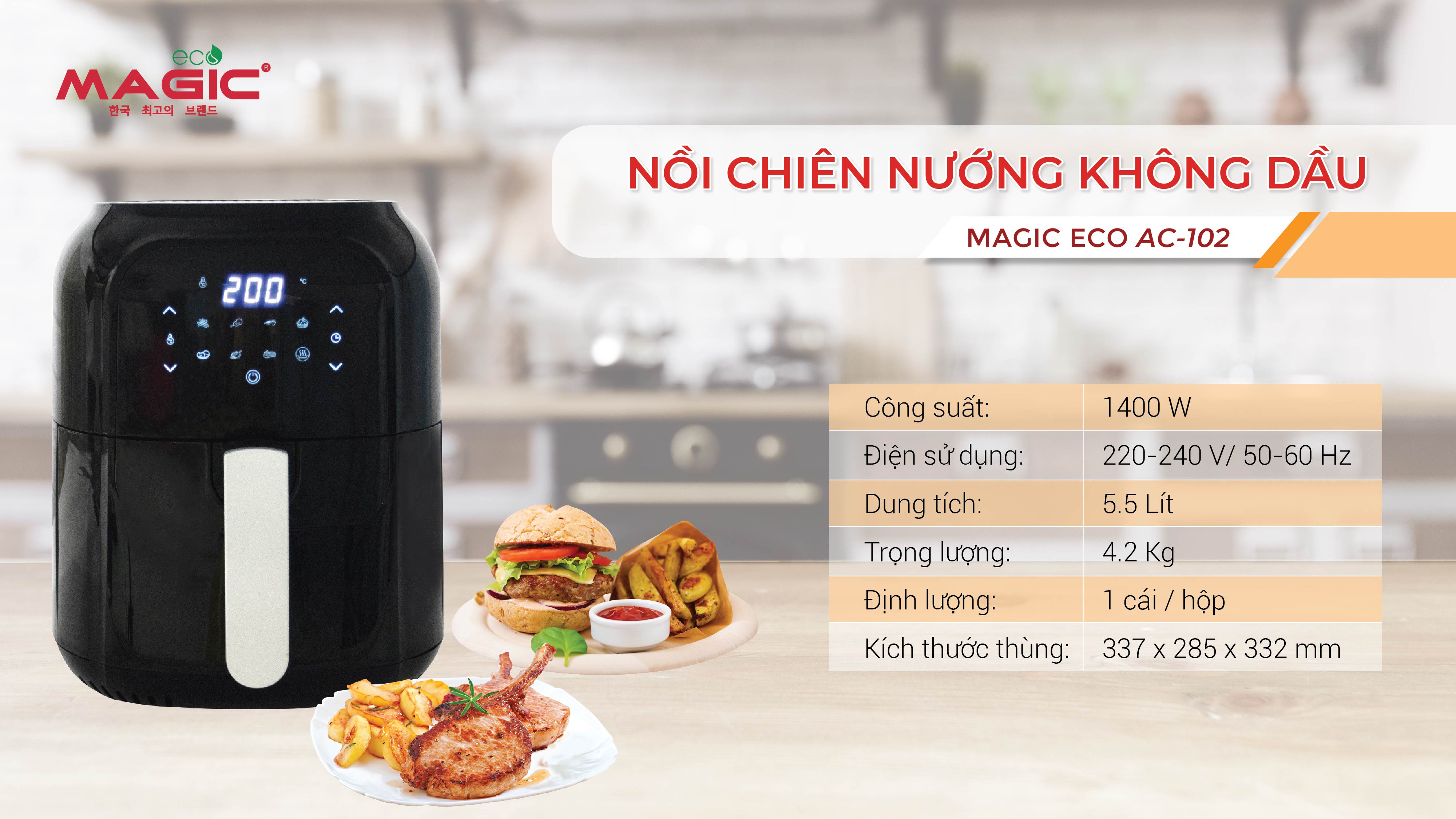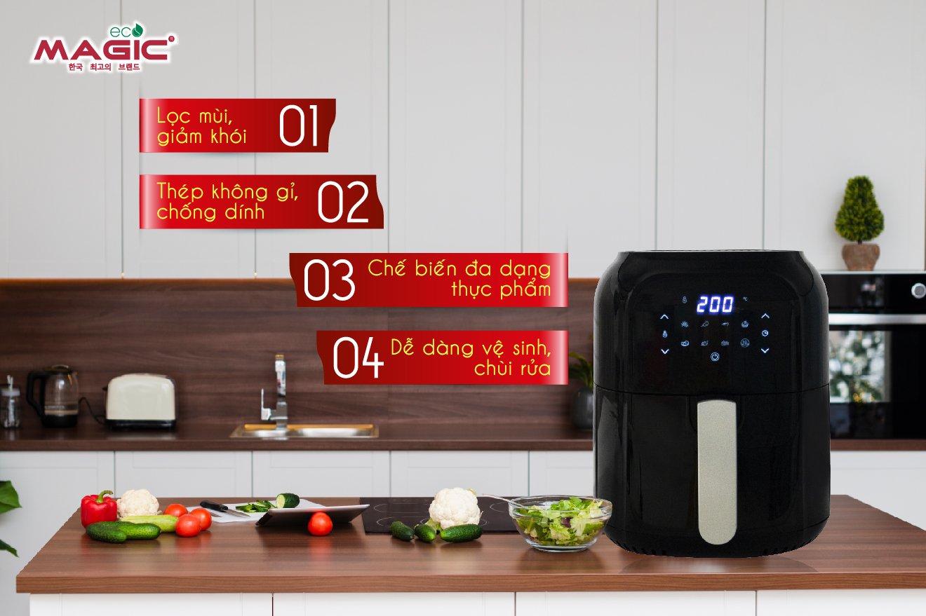 Nồi chiên không dầu điện tử Magic Eco AC-102 được tích hợp công nghệ đốt nóng chân không Rapid Air. Được biết đến với khả năng chiên nướng không sử dụng dầu mỡ đồng thời việc sử dụng nhiệt độ cao giúp loại bỏ tối đa 80-90% lượng mỡ thừa trong thực phẩm để bảo vệ sức khỏe người sử dụng, tránh nguy cơ mắc các bệnh béo phì, mỡ trong máu, tim mạch...sản phẩm tích hợp 8 chức năng nấu tự động với màn hình cảm ứng siêu nhạy. Dung tích lồng chiên 5.5 lít, sản phẩm mang thương hiệu Hàn Quốc, sản xuất tại Thái Lan.