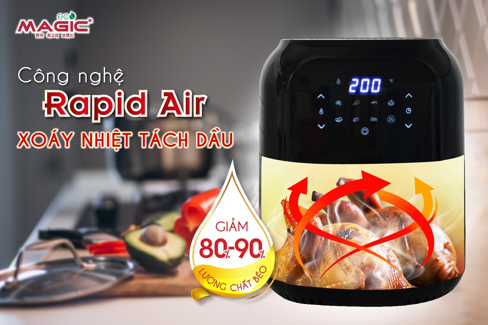 Chính việc sử dụng luồng không khí nóng để nấu chín thực phẩm giúp thực phẩm được chín đều nhưng không bị ngấm dầu mỡ, bên cạnh đó còn giúp loại bỏ đến 80-90% lượng mỡ thừa bên trong thực phẩm để bảo vệ sức khỏe người sử dụng, tránh nguy cơ mắc các bệnh béo phì, mỡ trong máu, tim mạch...