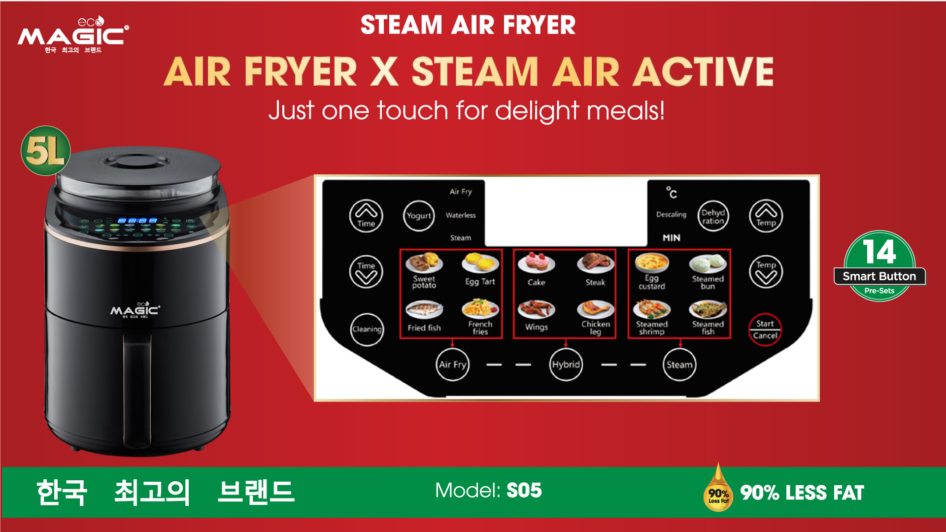 Nồi chiên không dầu kết hợp hấp Magic Eco S05 là sản phẩm dẫn đầu về công nghệ khi kết hợp công nghệ 3 trong 1: Chiên không dầu Rapid Air, Hấp siêu nhiệt Steam Air Active và Chiên kết hợp Hấp