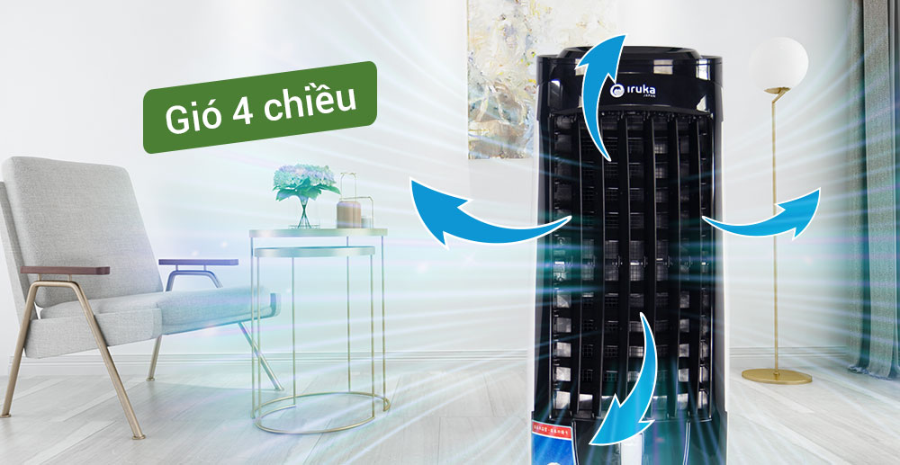 Không như những quạt thông thường khác, với quạt hơi lạnh iruka I-100 lượng gió tỏa ra được lan đều khắp không gian. Các lá chắn màn trước di chuyển liên tục để lượng gió tỏa ra có thể đều chung theo 4 hướng: trái phải, trên dưới.